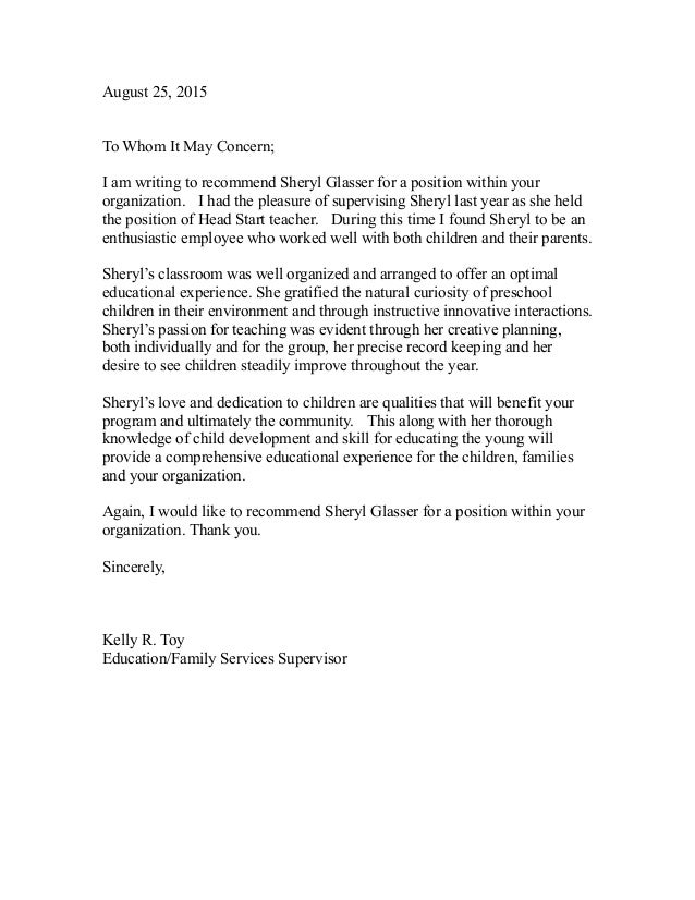 Sample recommendation letter for kindergarten student from the teacher the teacher writes this letter referring to his or her student. Name of addressee designation organization name organization address. The letter should not only give credentials such as a degree in education bit is should also mention the good character traits of the applicant. A reference letter for child custody is written by some other person on behalf of the individual.